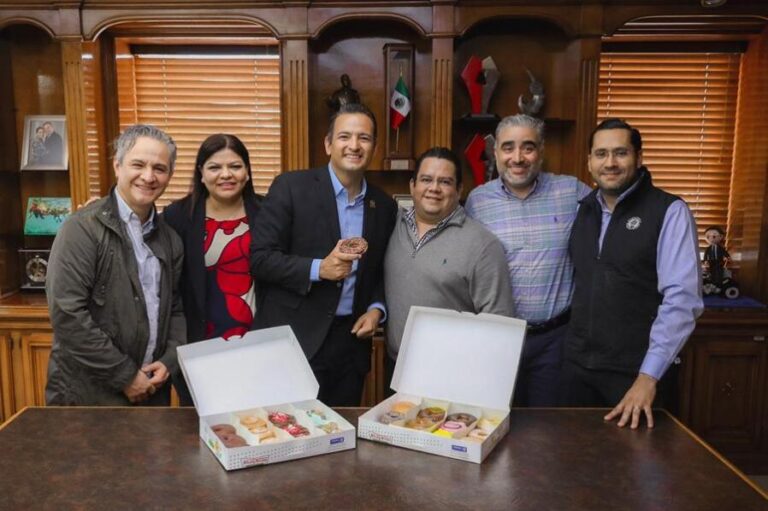 Chihuahua, Chih.- El alcalde Marco Bonilla Mendoza, recibió en su despacho a los gerentes de Krispy Kreme México, quienes le presentaron el proyecto que desarrollarán en la ciudad de Chihuahua, en Distrito 1. En general hablaron de la inversión que representa, los empleos que generará la llegada de esta tienda de donas y la invitación formal para la apertura, el próximo 9 de junio.