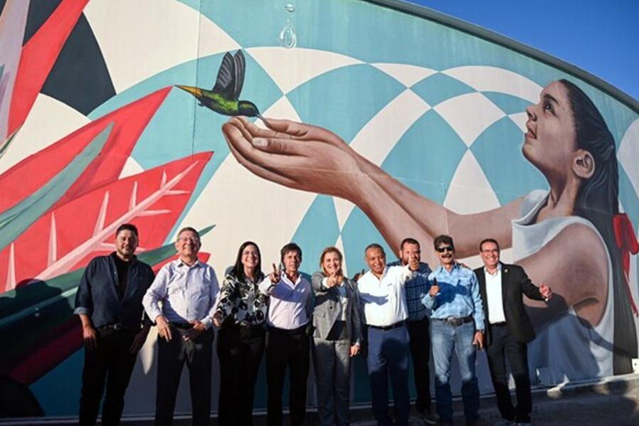 Este tanque superficial, que tiene plasmado el mural titulado “Oásis”, del artista local Arturo Damasco, surtirá, almacenará y administrará con tecnología de última generación, el abasto del vital líquido en la zona.