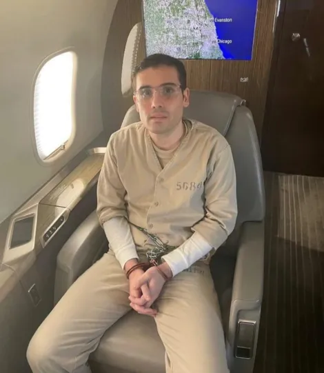En la imagen, se puede observar a Ovidio Guzmán con las manos esposadas y cadenas que rodean su cintura, lo que refleja las estrictas medidas de seguridad en torno a su traslado a territorio estadounidense. El rostro de Guzmán muestra una mezcla de seriedad y preocupación, ya que enfrenta un proceso legal que podría resultar en una larga condena en prisión.